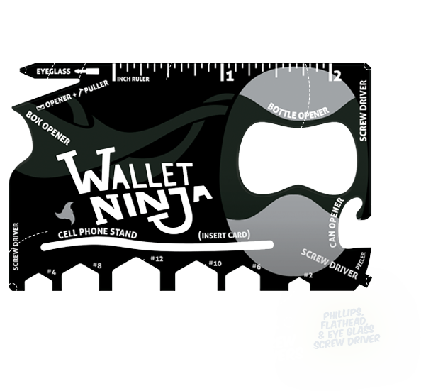 Nindža ili ti Ninja Wallet je prvi i najpoznatiji alat za preživljavanje u obliku kreditne kartice. Nudi zaista mnogo funckija, pri čemu su neke od njih zavrtač šarafa na naočarama, otvarač za flaše, držač telefona, šrafciger, otvarač konzervi, otvarač kutija, alat za vađenje eksera, mini lenjir, otvarač koverata, 4 zavrtača i odvrtača itd. Za više informacija posetite sajt Ninja Wallet (http://www.walletninja.com/) ili pogledajte video klip ispod.